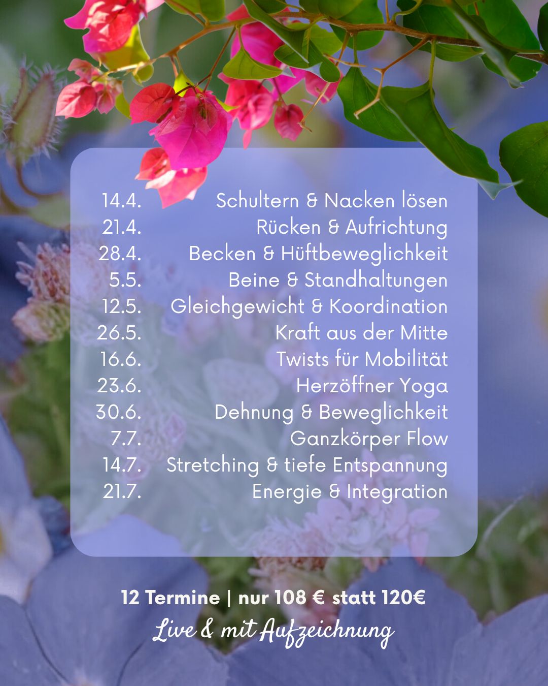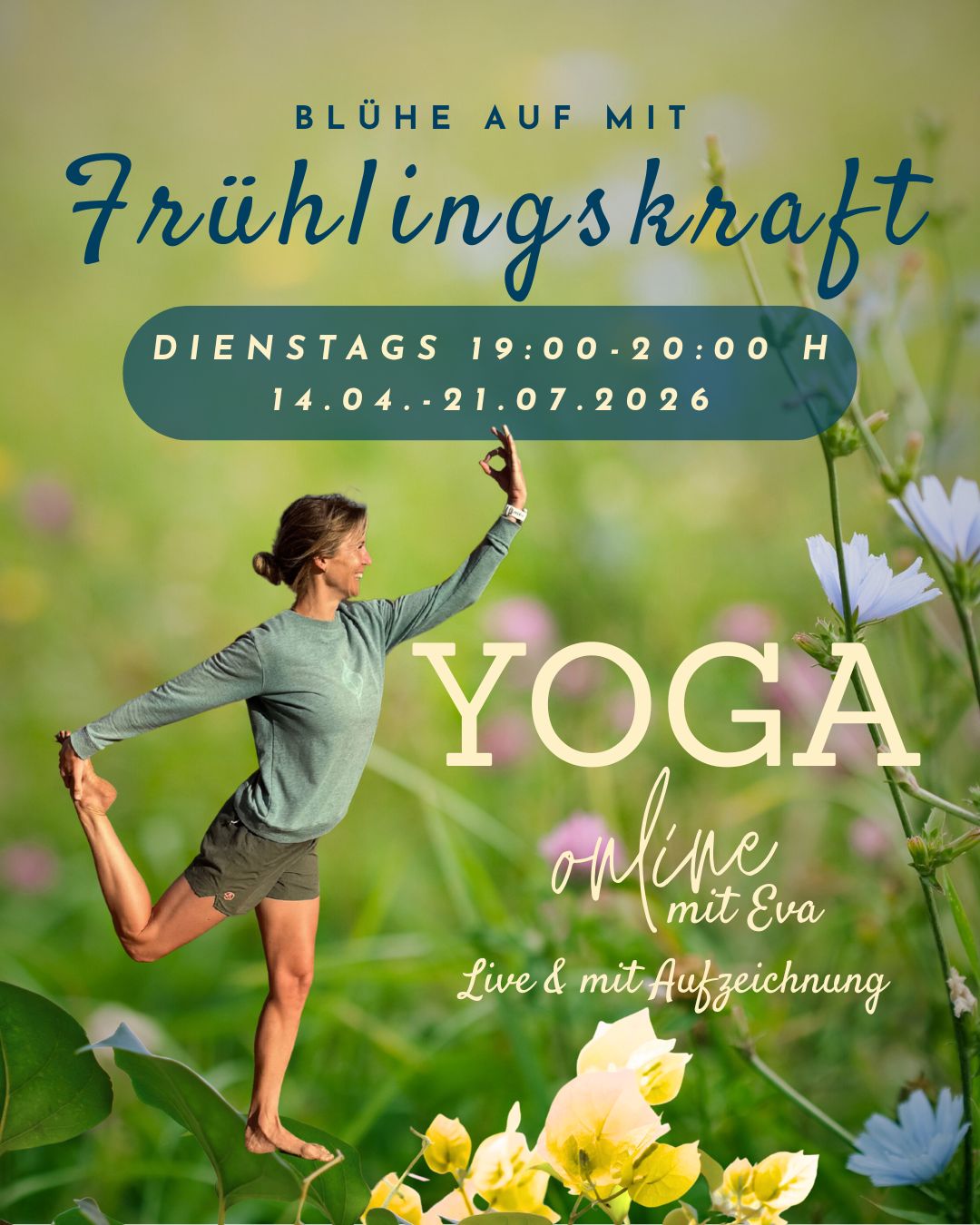 Blühe auf mit Frühlingskraft! Mein neuer Online Yoga Kurs startet am 14. April 2026. Dich erwarten 12 Live-Einheiten, jeden Dienstag von 19:00–20:00 Uhr, mit Aufzeichnung zum Nachholen, wann immer du möchtest!